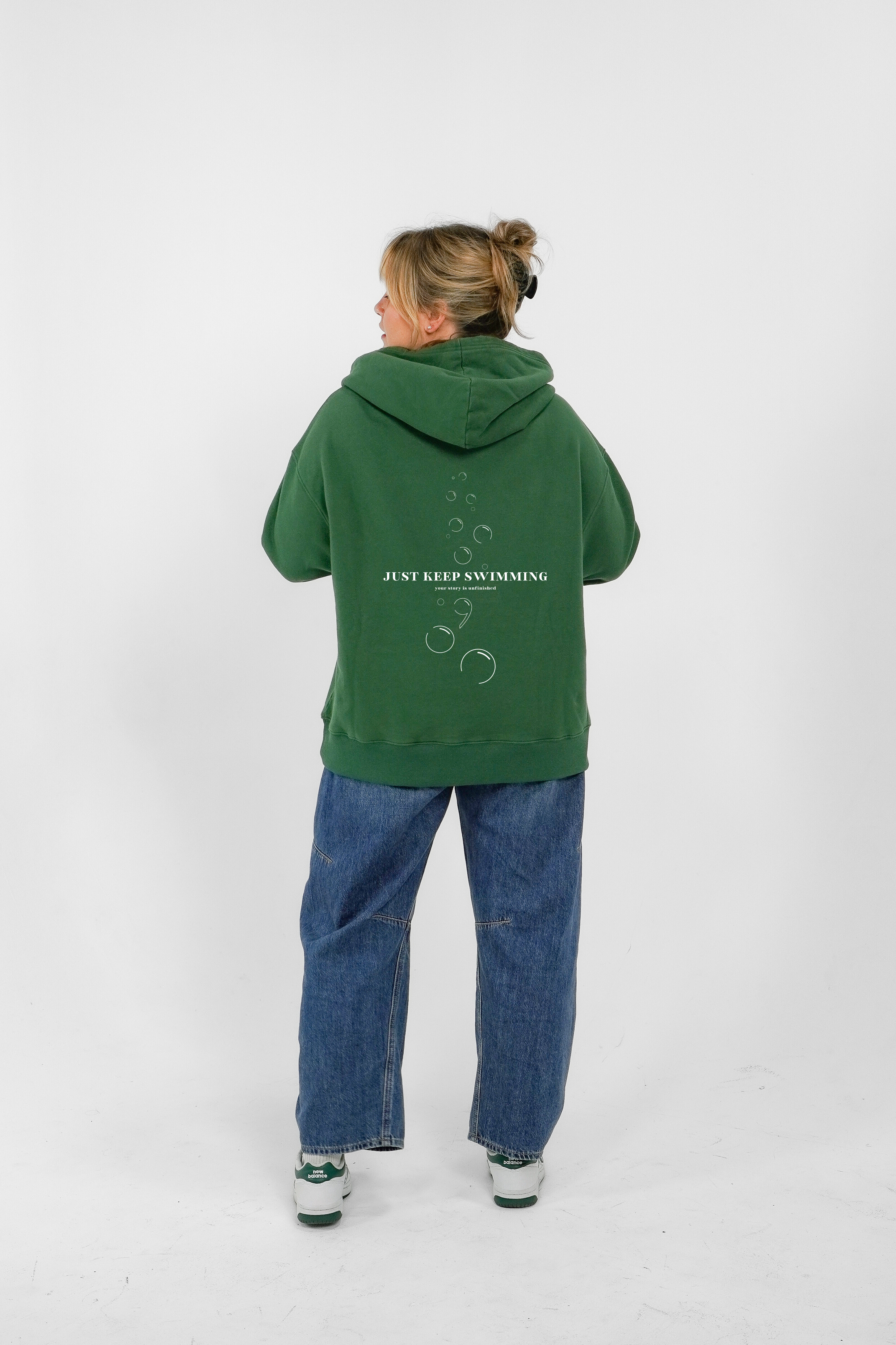 Our signature Mariposa hoodie with the white Just Keep Swimming design