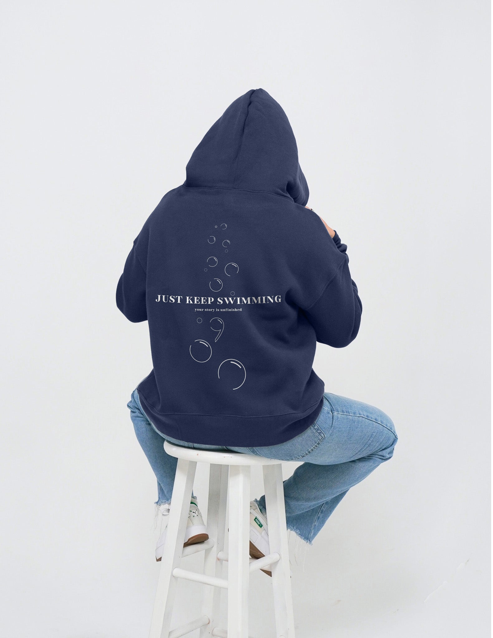 - Back print with Just Keep Swimming and Your Story Is Unfinished and Bubbles design