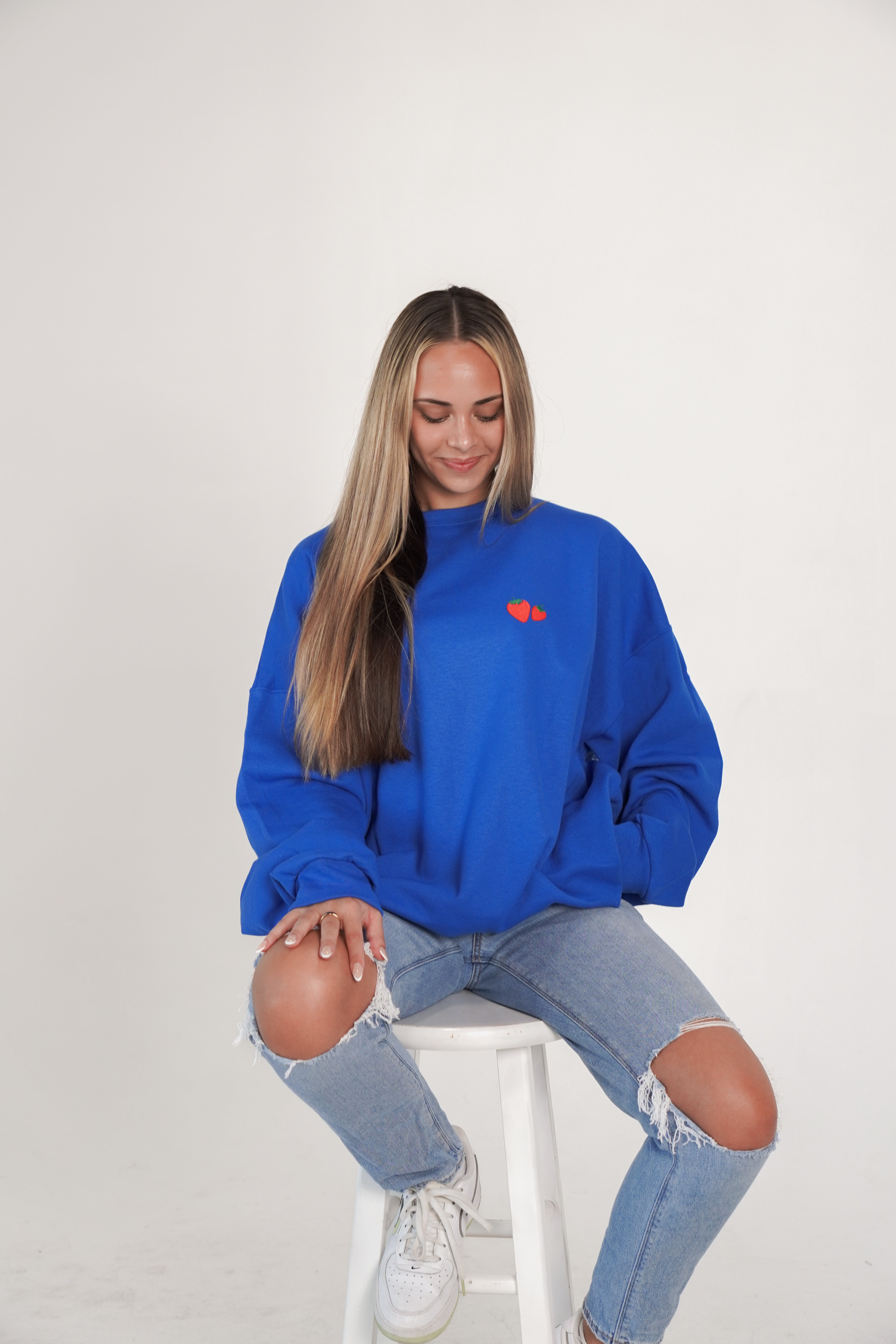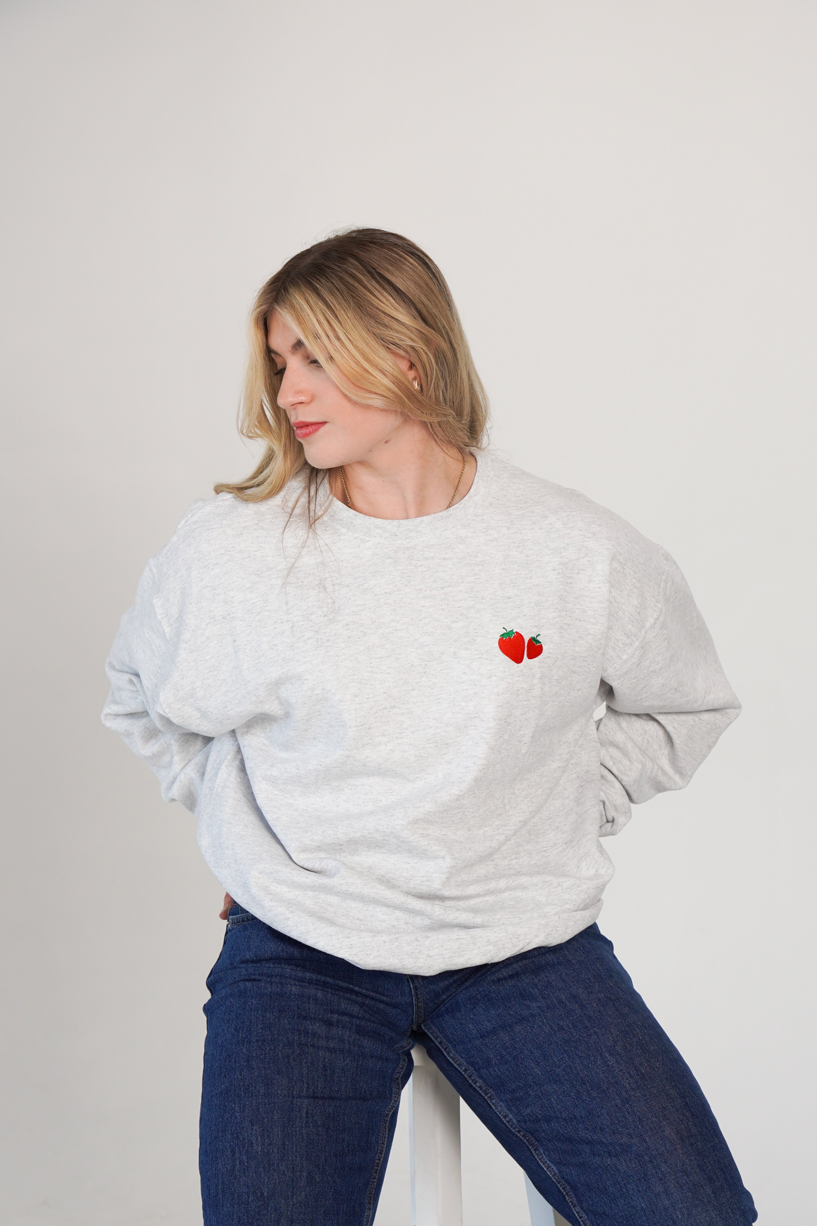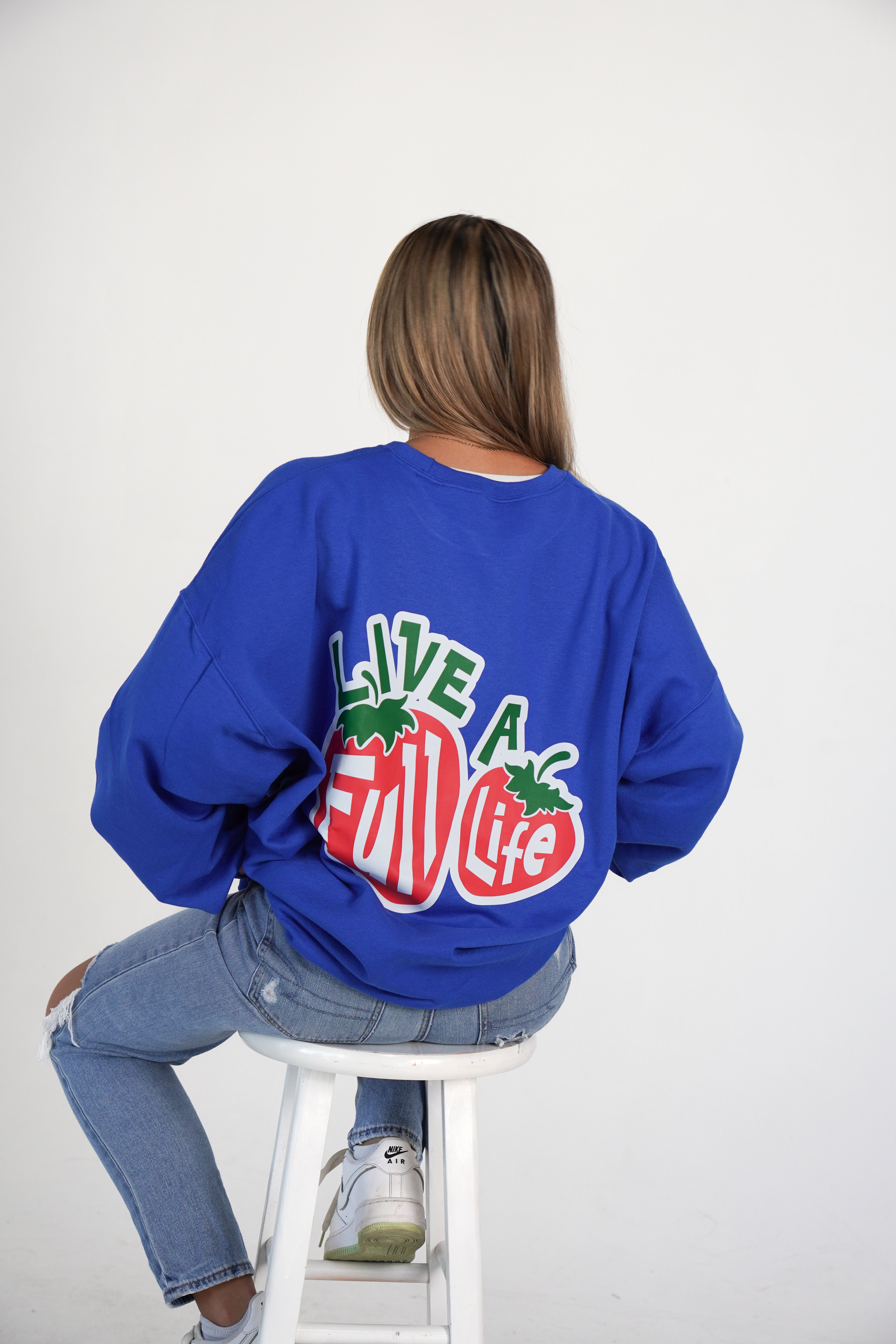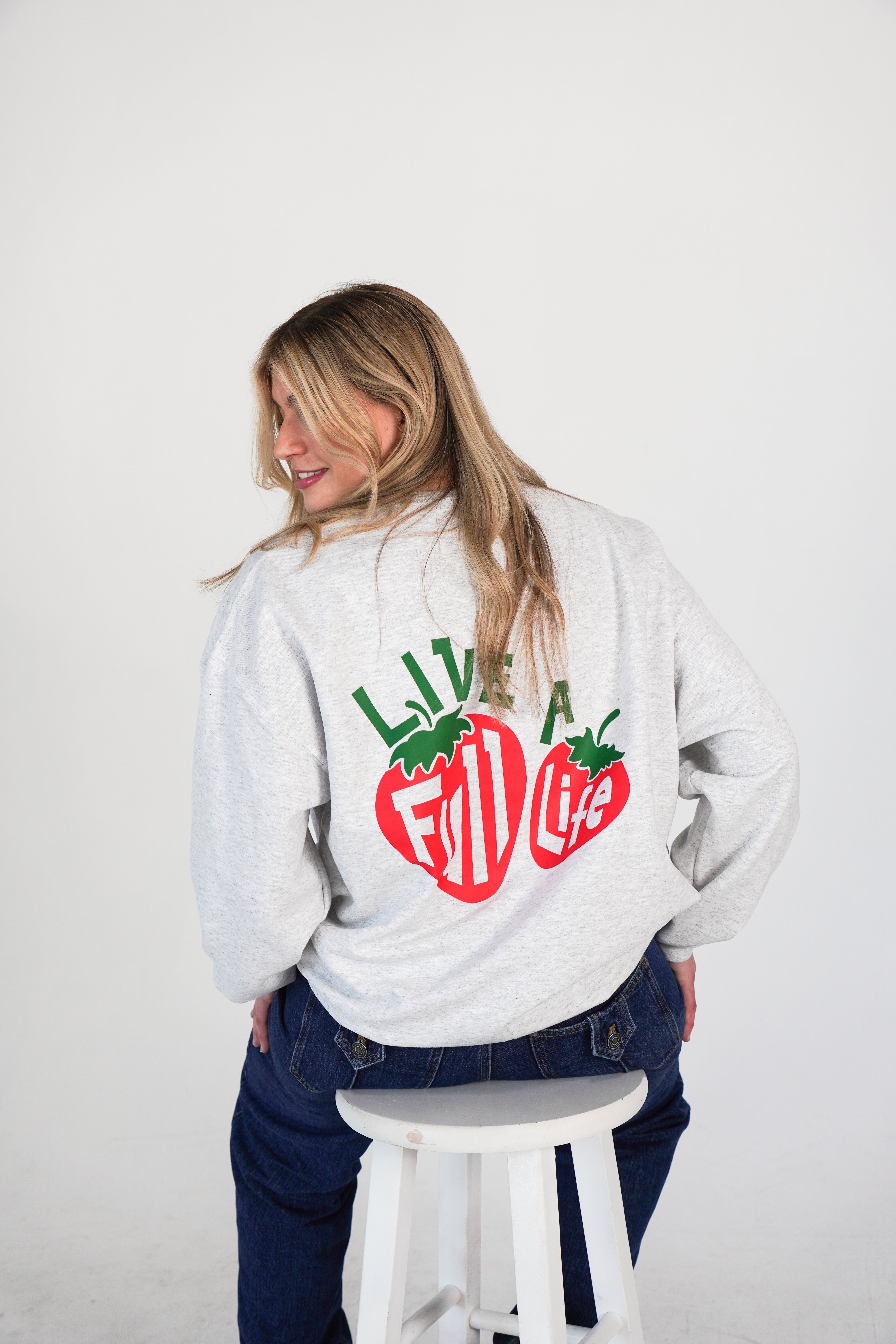 - Two strawberries embroidered on left chest with Live a Full Life back print