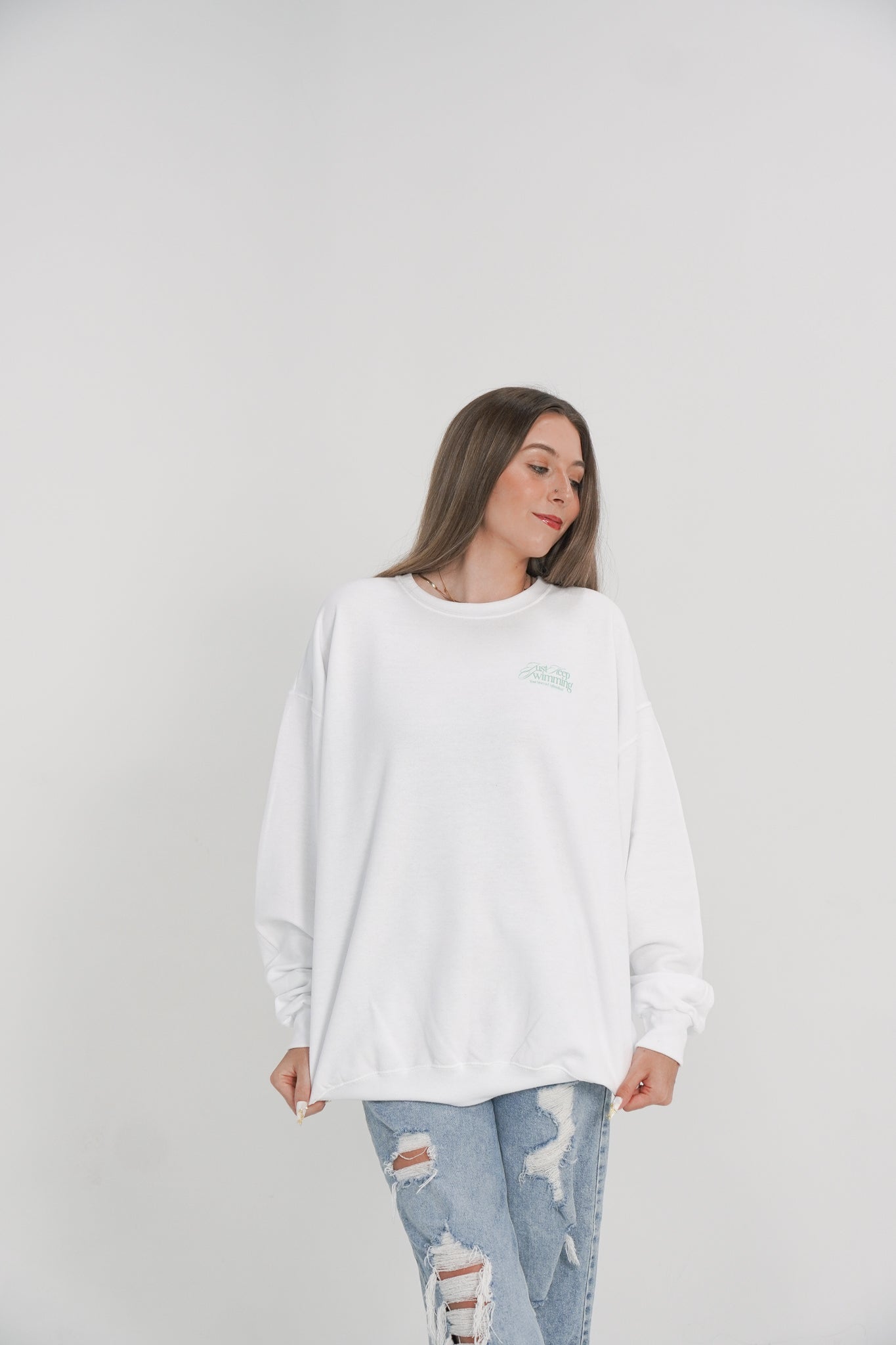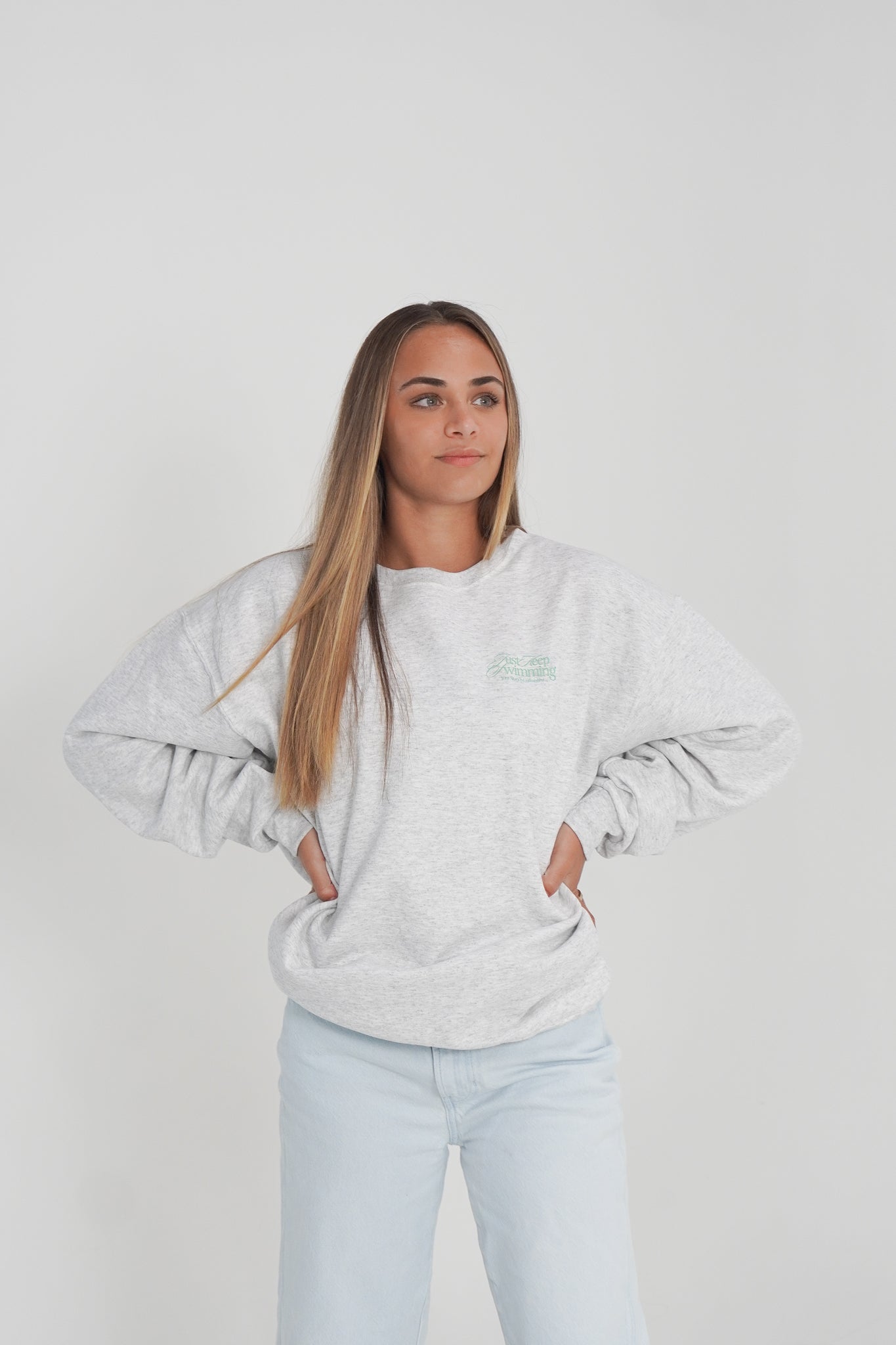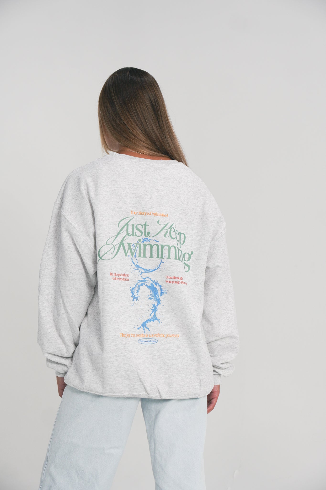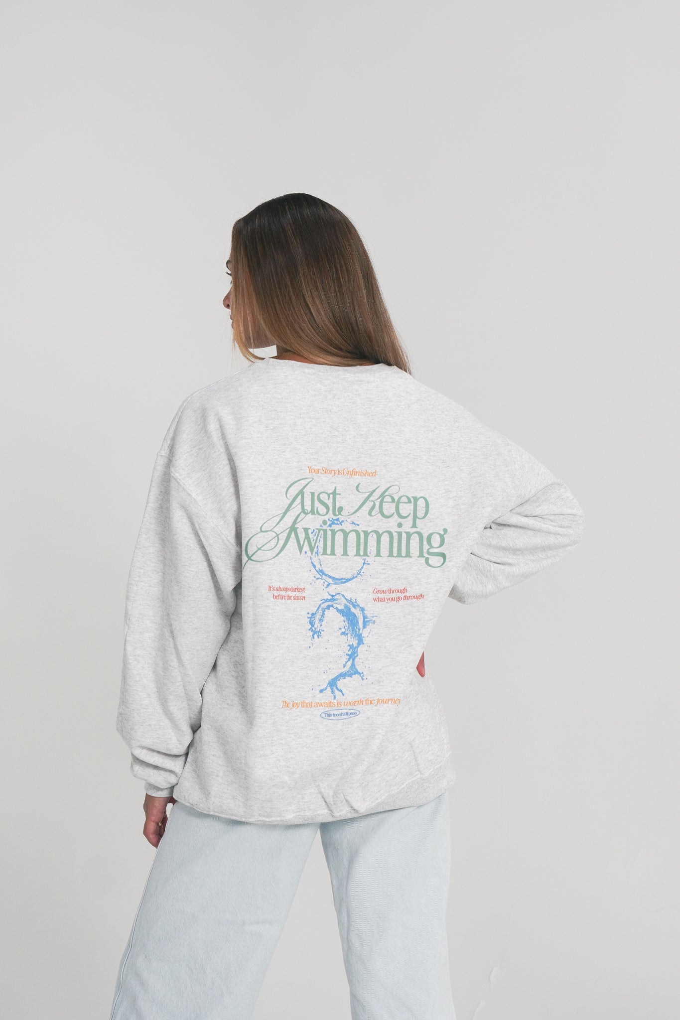 Our Origins crewneck with the rainbow Just Keep Swimming '24 design