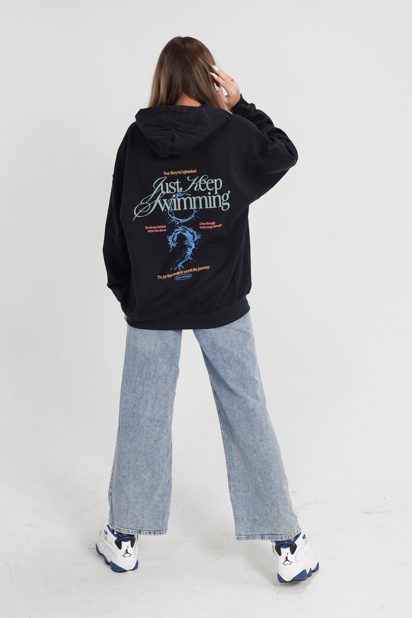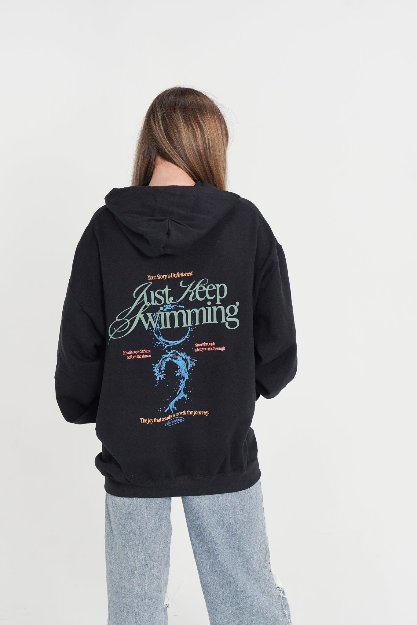 Our Origins hoodie with the rainbow Just Keep Swimming '24 design