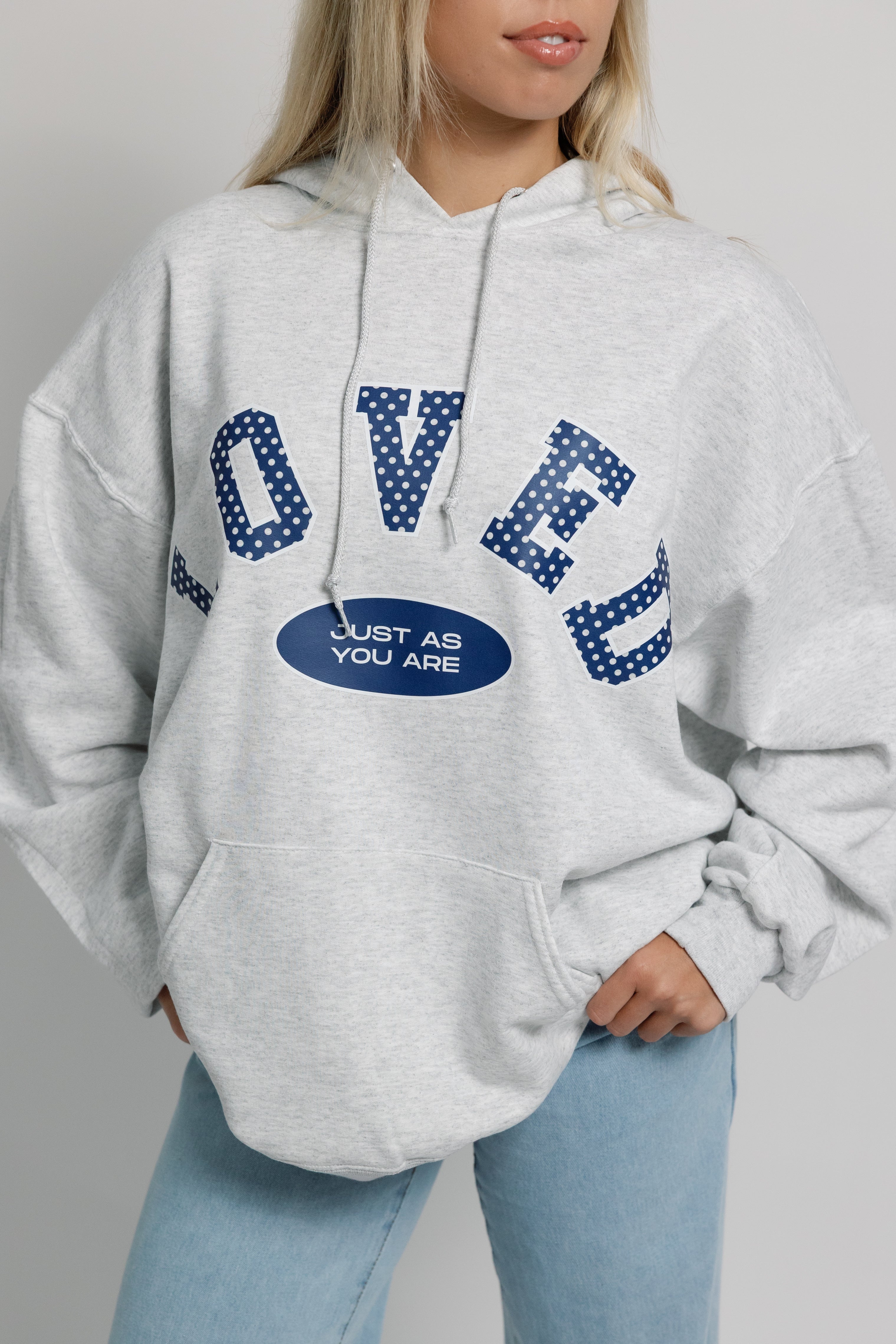 - Spotted LOVED design across the chest with Just As You Are below