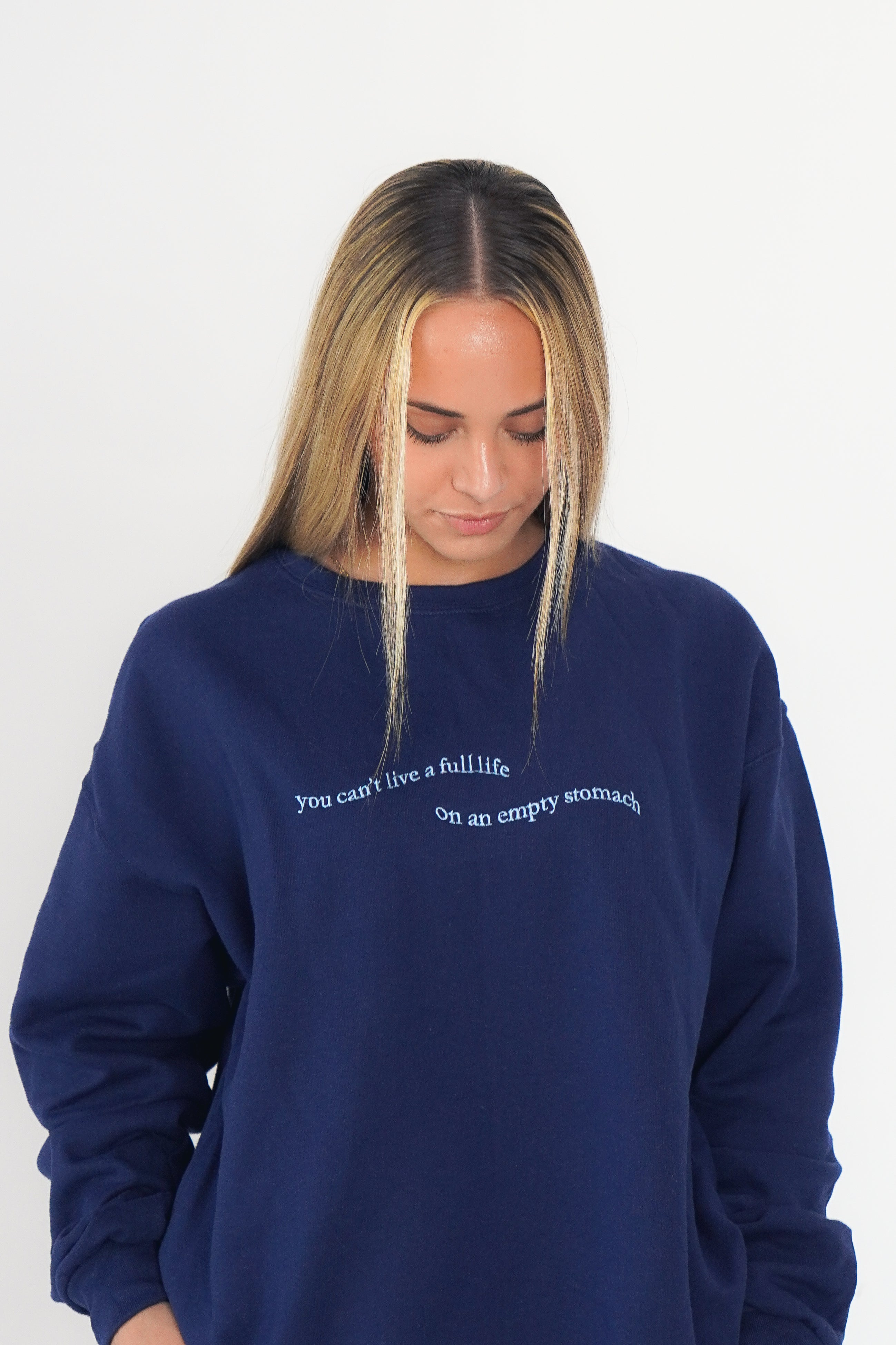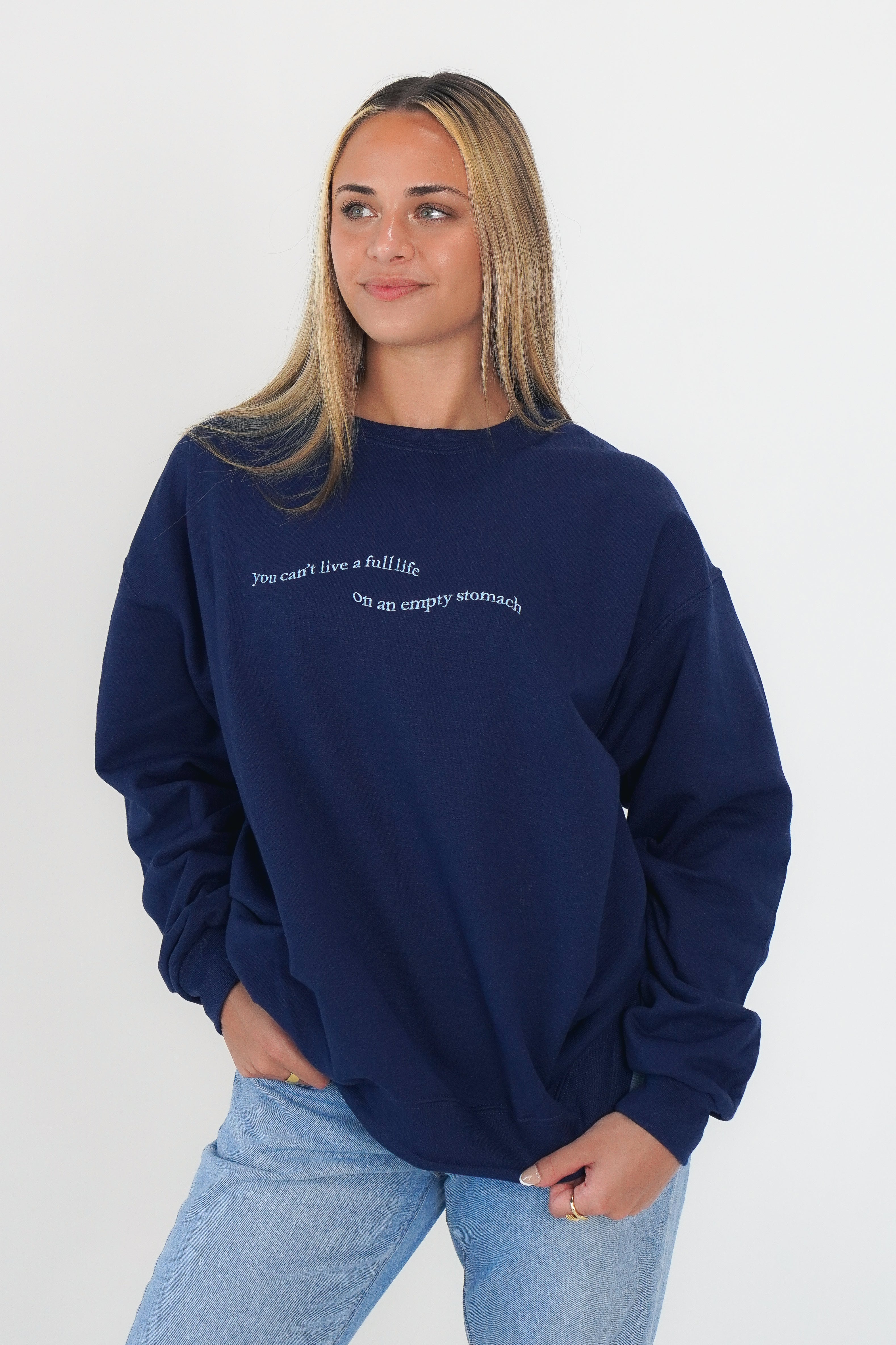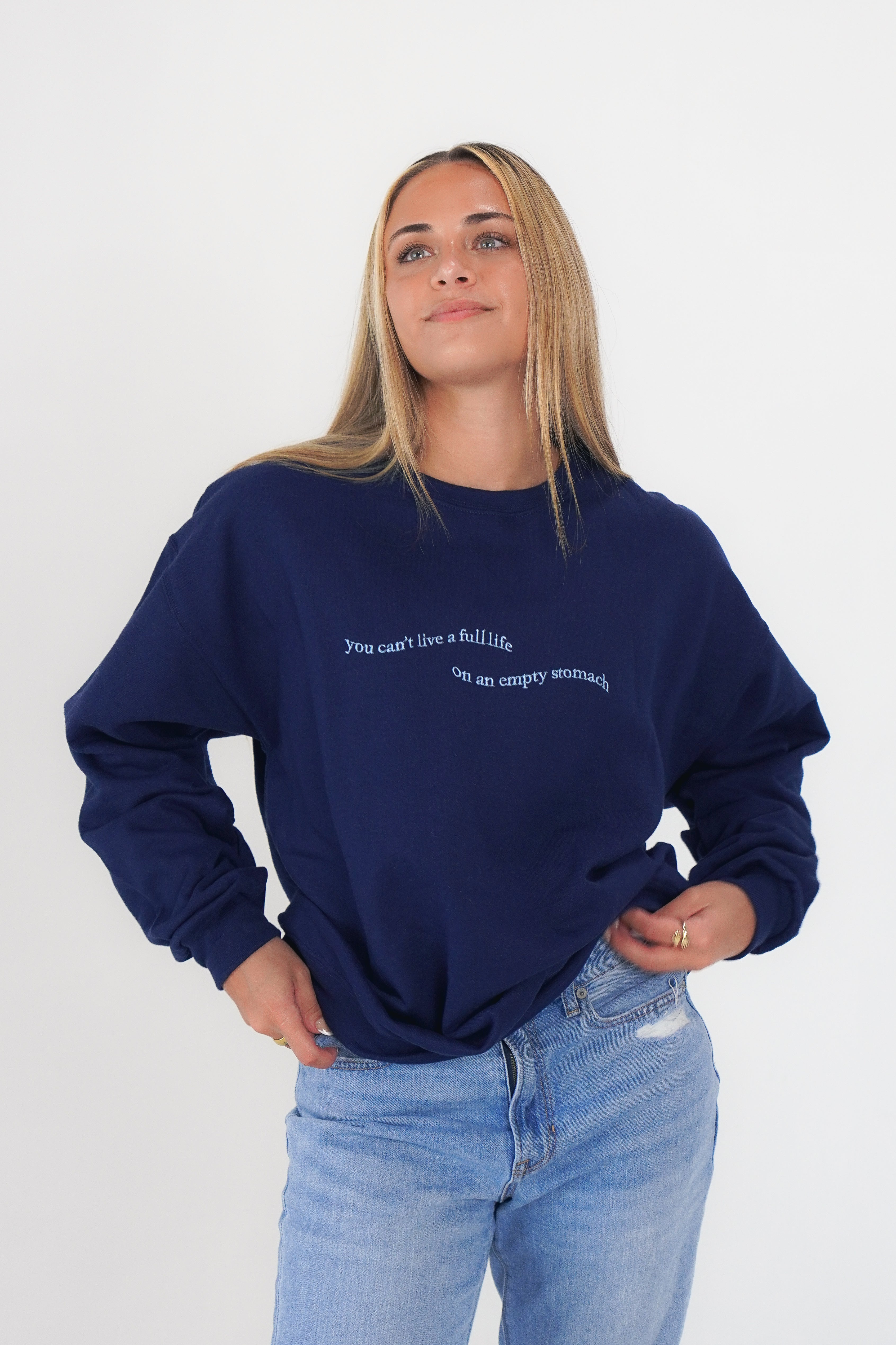 Our Origins crewneck with our You Can't Live a Full Life on an Empty Stomach design in honor of NEDA week