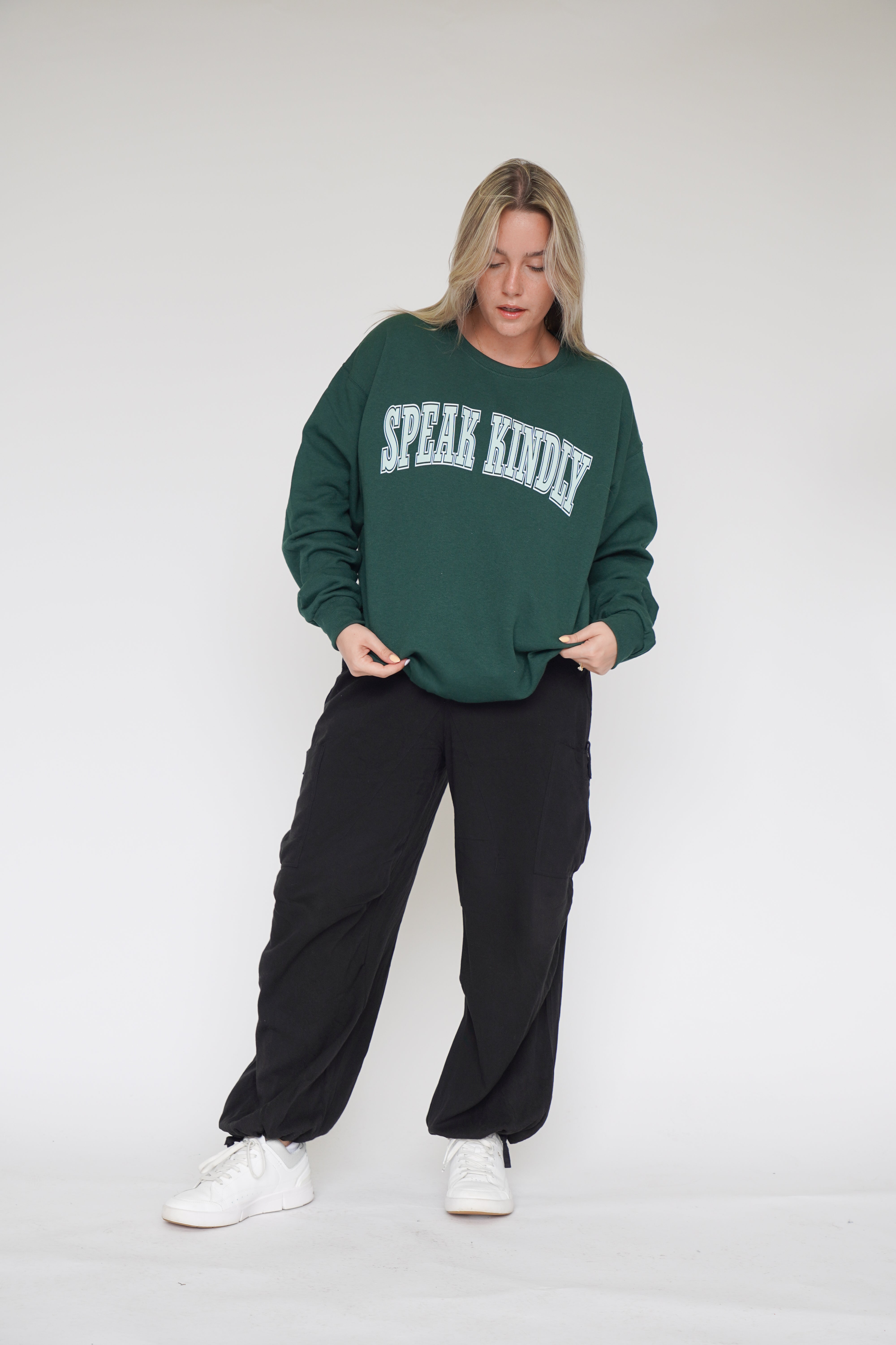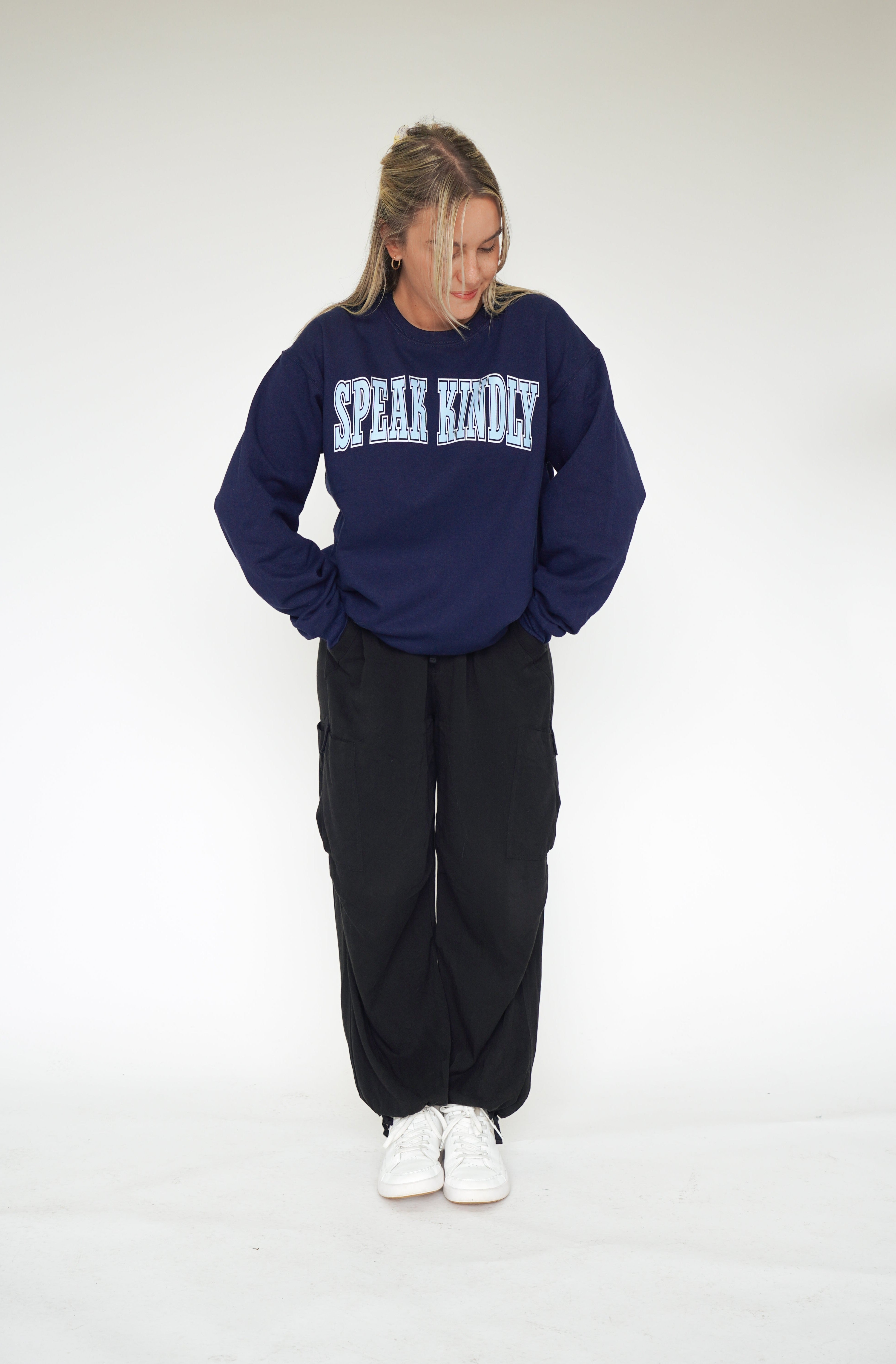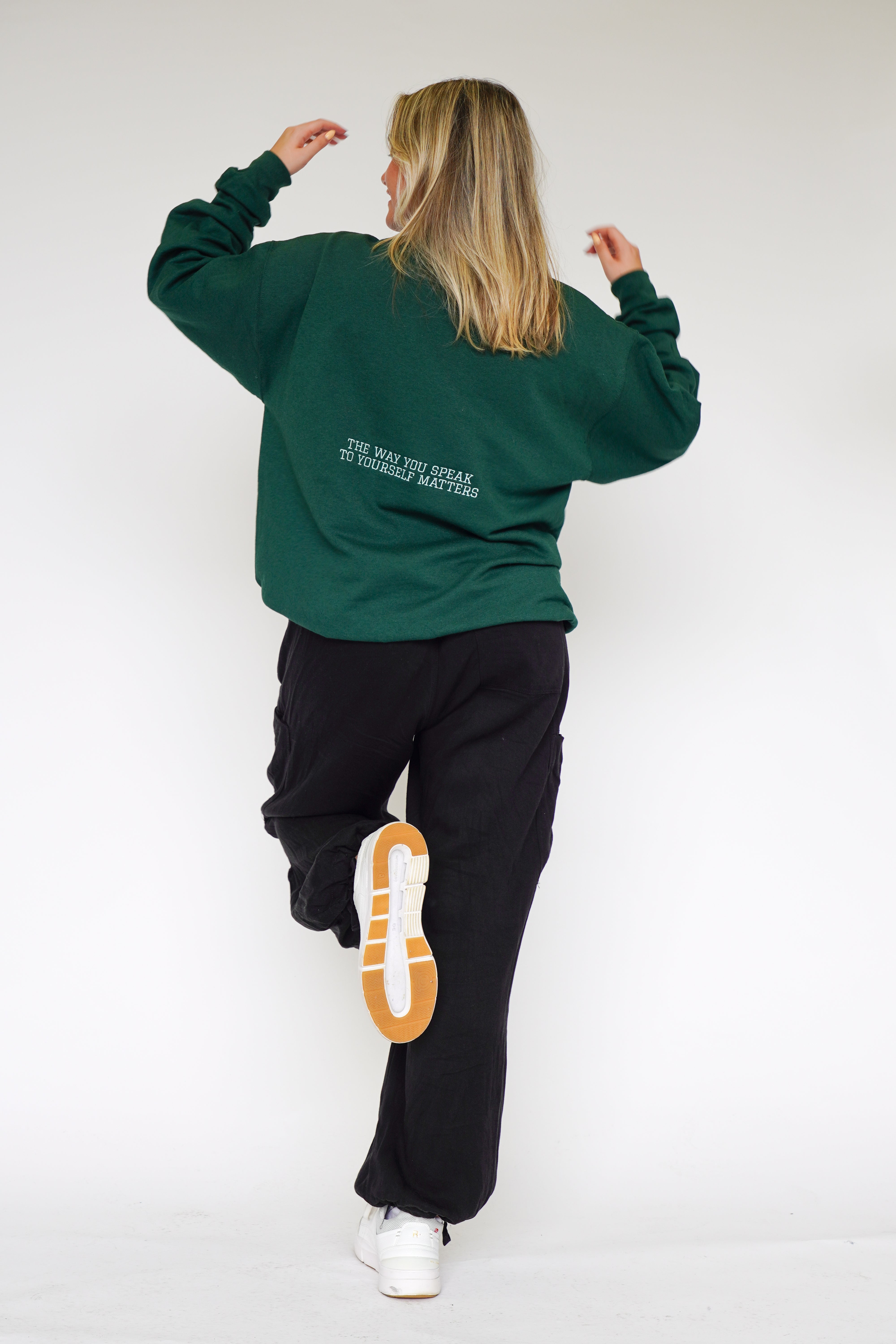 - SPEAK KINDLY printed on the front chest and THE WAY YOU SPEAK TO YOURSELF MATTERS embroidered on the mid-back