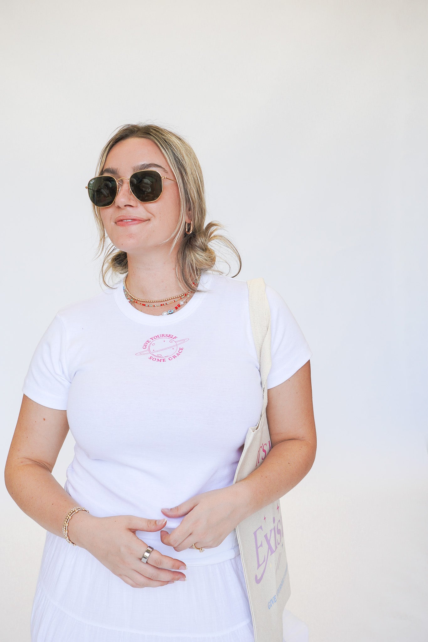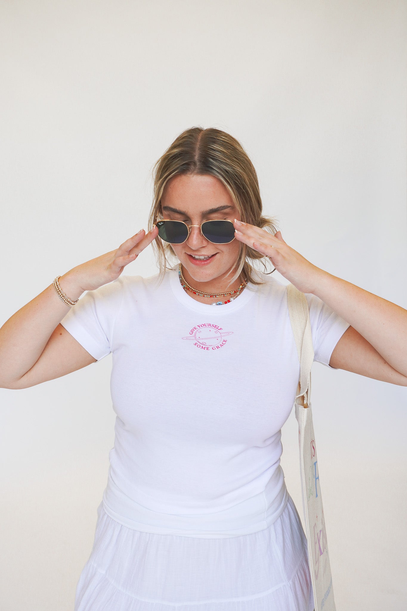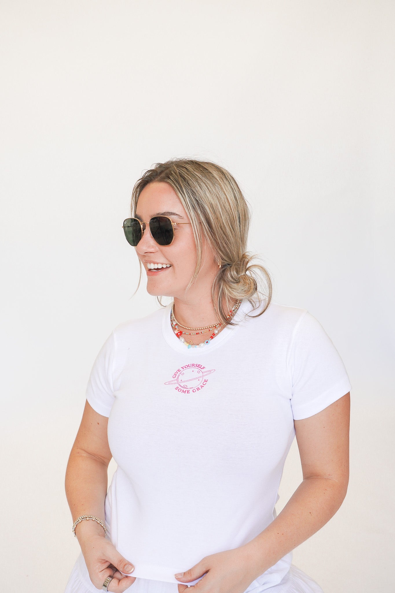 Our Origins baby tee featuring the GIVE YOURSELF SOME GRACE design.